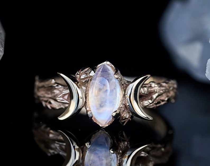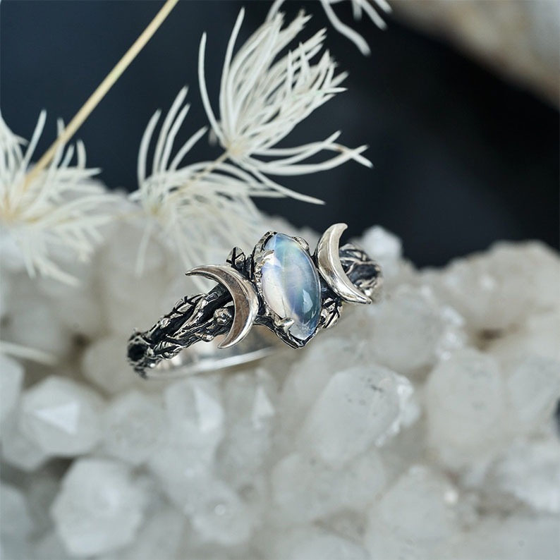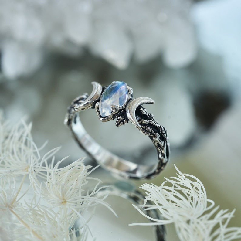 Our triple moon Moonstone ring "Soma" to reveal the sacred meaning of number "3". The three Moons - waxing, full and waning - indicate circles of life of every woman and represent 3 mayor properties essential for you: intuition, creativity, wisdom.