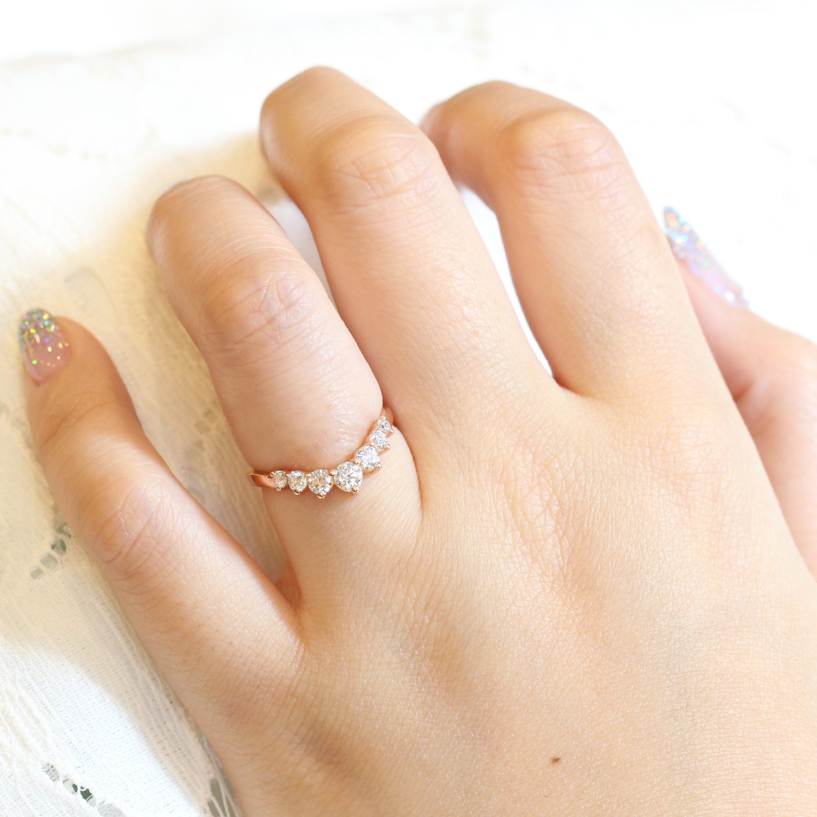 Breathtakingly gorgeous one of a kind moissanite bridal set features a pear moissanite engagement ring set in tiara halo diamond ring setting with an 8x5mm pear cut forever one moissanite center. To complete the stunning look, a large 7 stone wedding band is created to be paired with this moissanite diamond ring!