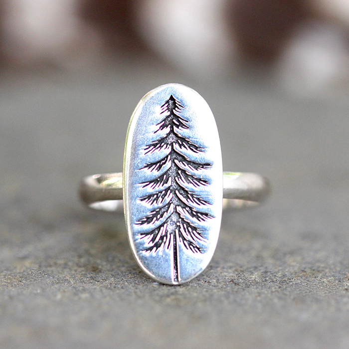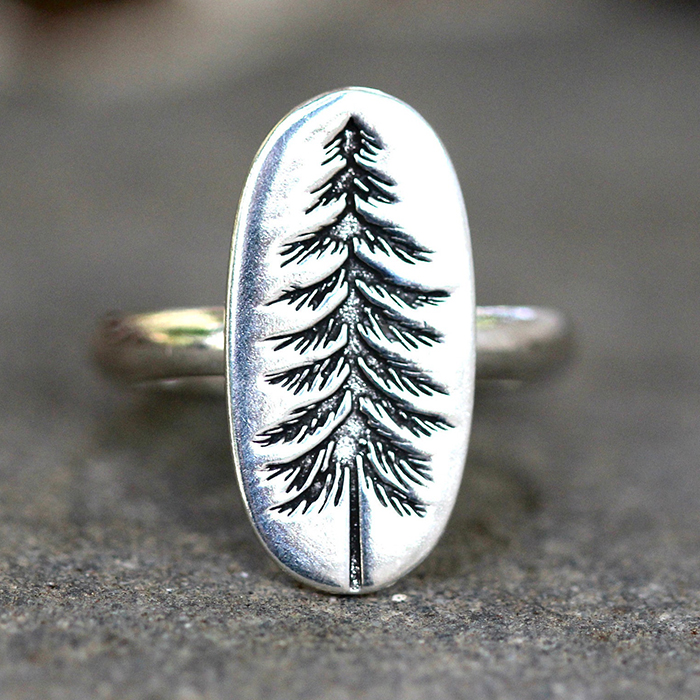 The oval pine tree focal features a deeply engraved and detailed pine tree. Wear this tree ring daily to remind yourself of your love of nature, hiking, and the forest.