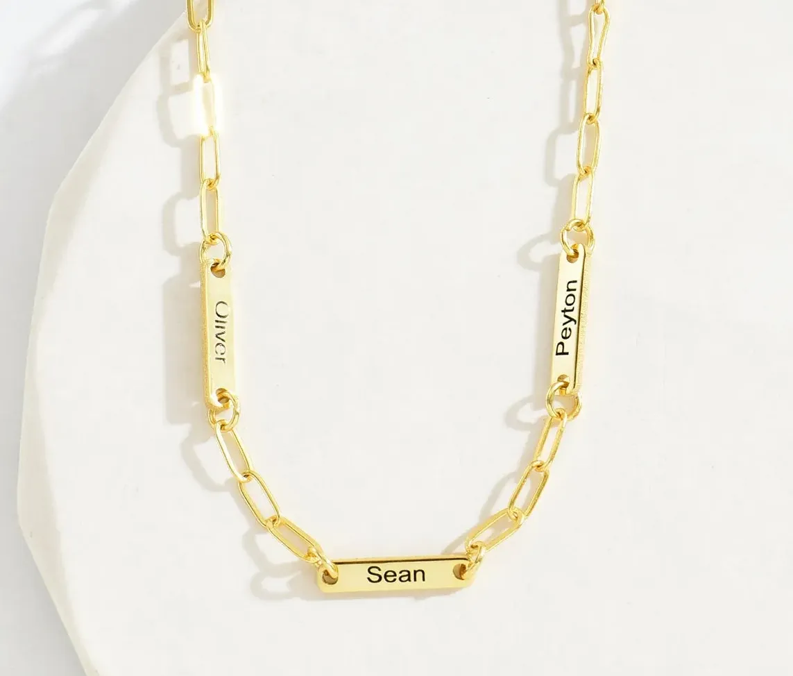 The necklace can have up to 3 names of your choice, each suspended from its own individual link, so you can create a unique and personalized piece of jewelry that will be cherished for years to come.